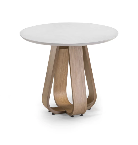 Mesa con base escultórica en madera curvada y tapa lisa. Ideal para espacios modernos y pequeños.